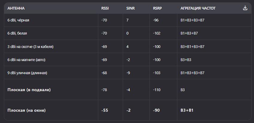 3️⃣ Плоская антенна на окне дала рекордный RSSI (-55!), но агрегация упала до двух частот (B3+B1). Скорость при этом была ниже, чем у компактных «рожков».